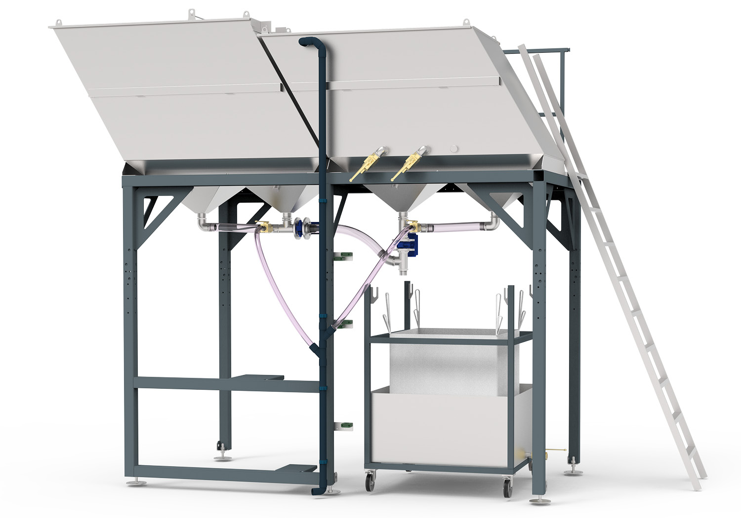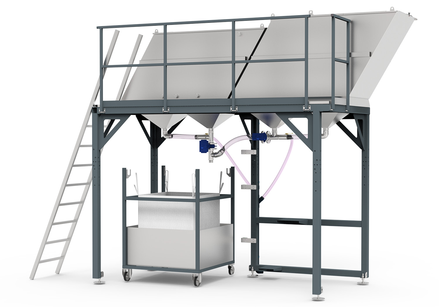 Der Schmutzwassertank ist trichterförmig geschweißt. Die Sedimente sammeln sich kontrolliert am Boden und werden in definierten Intervallen automatisch in den Big Bag gespült.